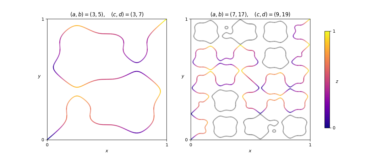 Shown above are two examples, as viewed from above the cube. That is, we see the paths projected onto the -plane, with corresponding values indicated with varying colour. In the second example some paths are coloured grey to indicate that, while they exist, they do not form part of the path from to .
